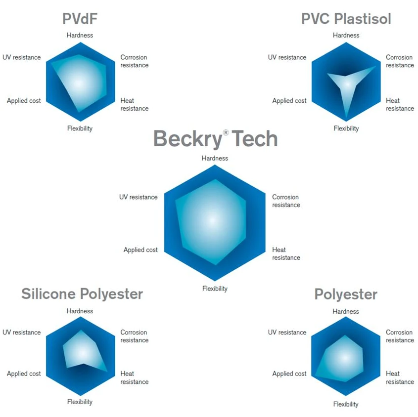 BeckryTech® is a complete coating system, consisting of primers and topcoats which together give a paint film with optimal characteristics. It is an exceptionally good choice for increased lifespan. It doesn’t chalk and performs well when it comes to colour, gloss and erosion and provides excellent UV resistance of polyester based coatings. BeckryTech® offers 40 years for film integrity and a period of 30 years after shipment for both chalking and colour change.